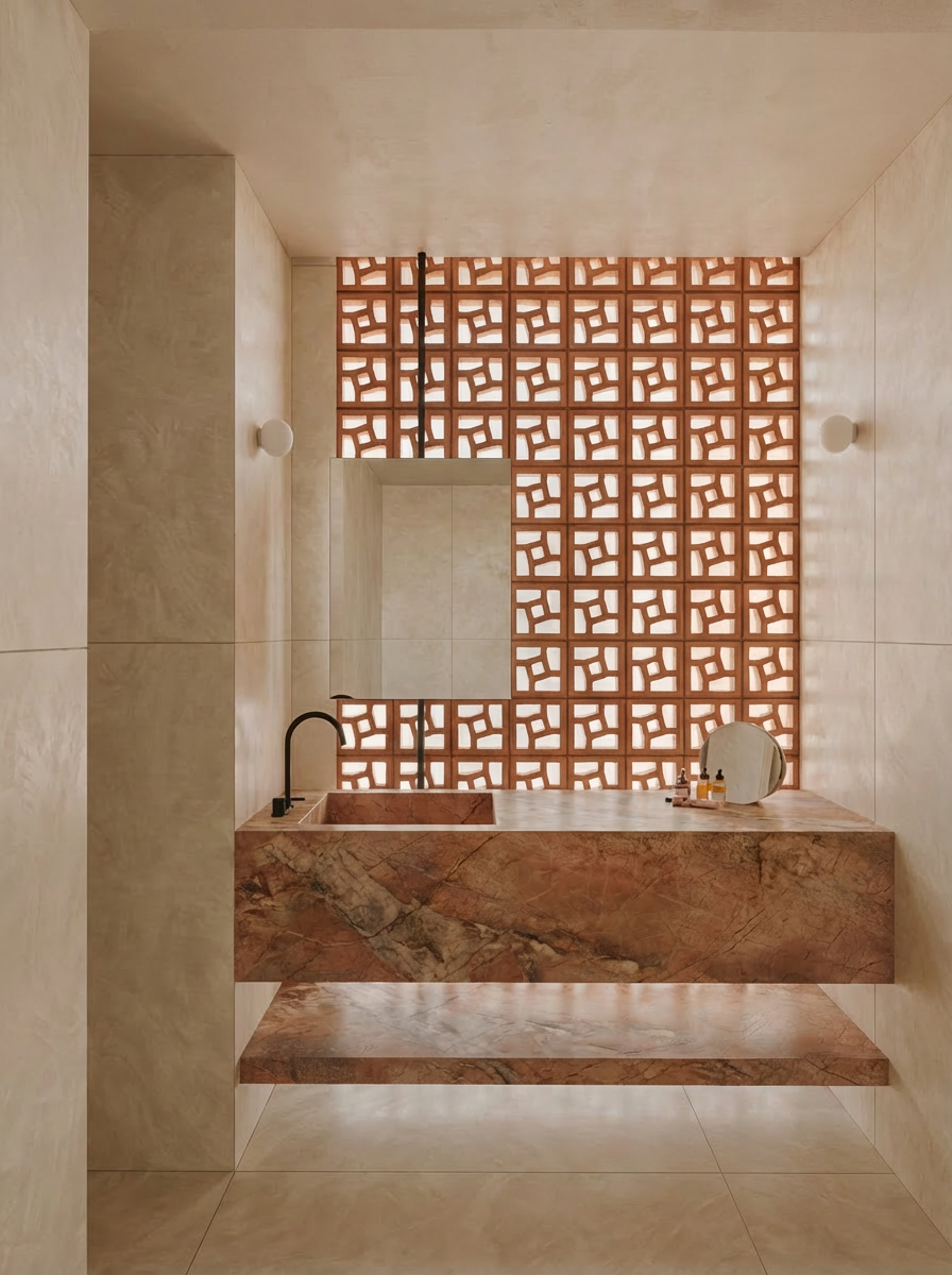 The Breche de Benou is intense—it has deep reds, pinks, and chaotic veining. If we had used a busy floor tile, it would have been overwhelming. But set against the seamless, large-format Venato Bianco, the vanity becomes a sculpture. The look is finished with the Kaolin breeze blocks, which filter the light and tie back to the living room’s accent wall. It’s a perfect balance of raw and refined.