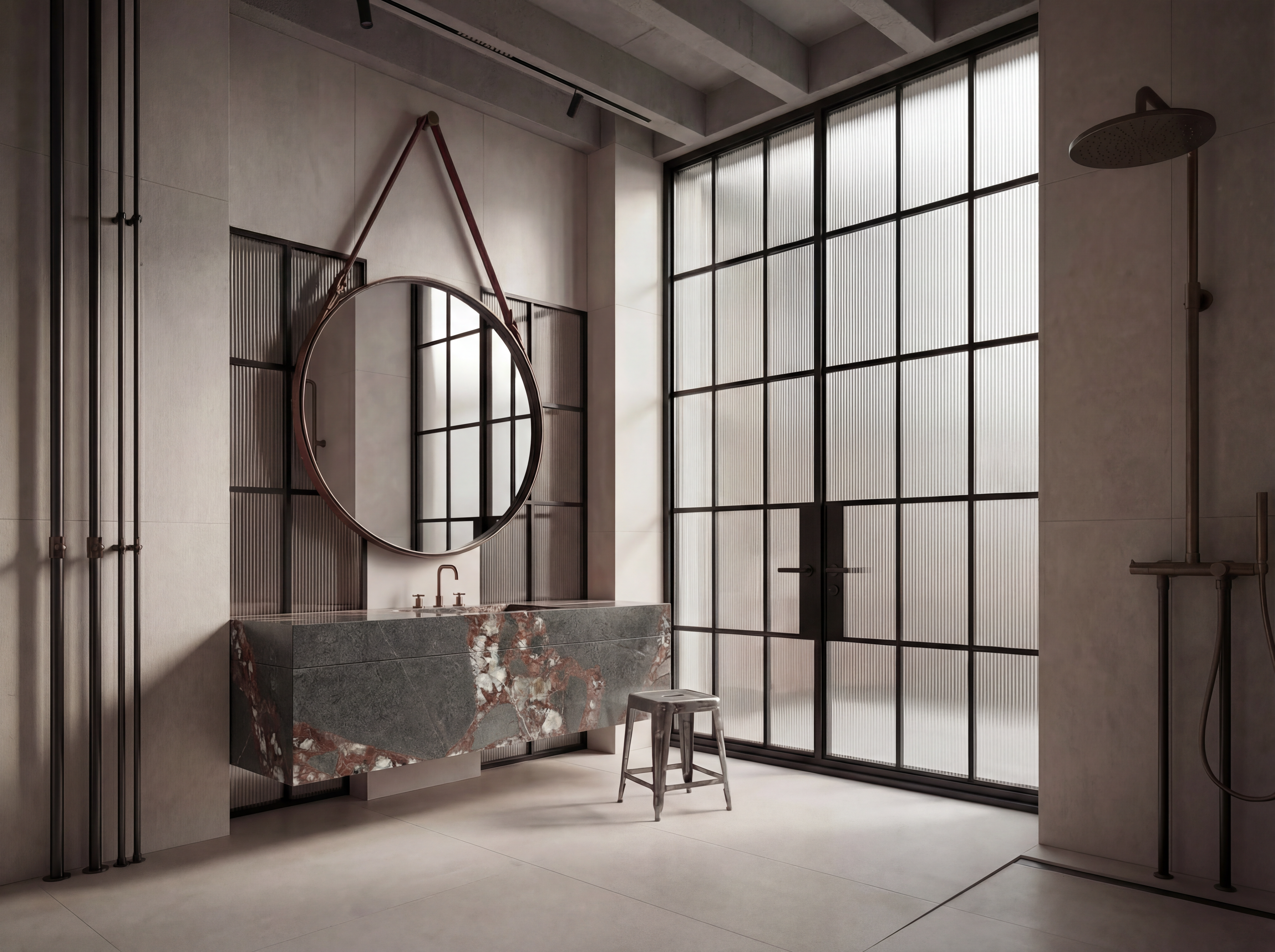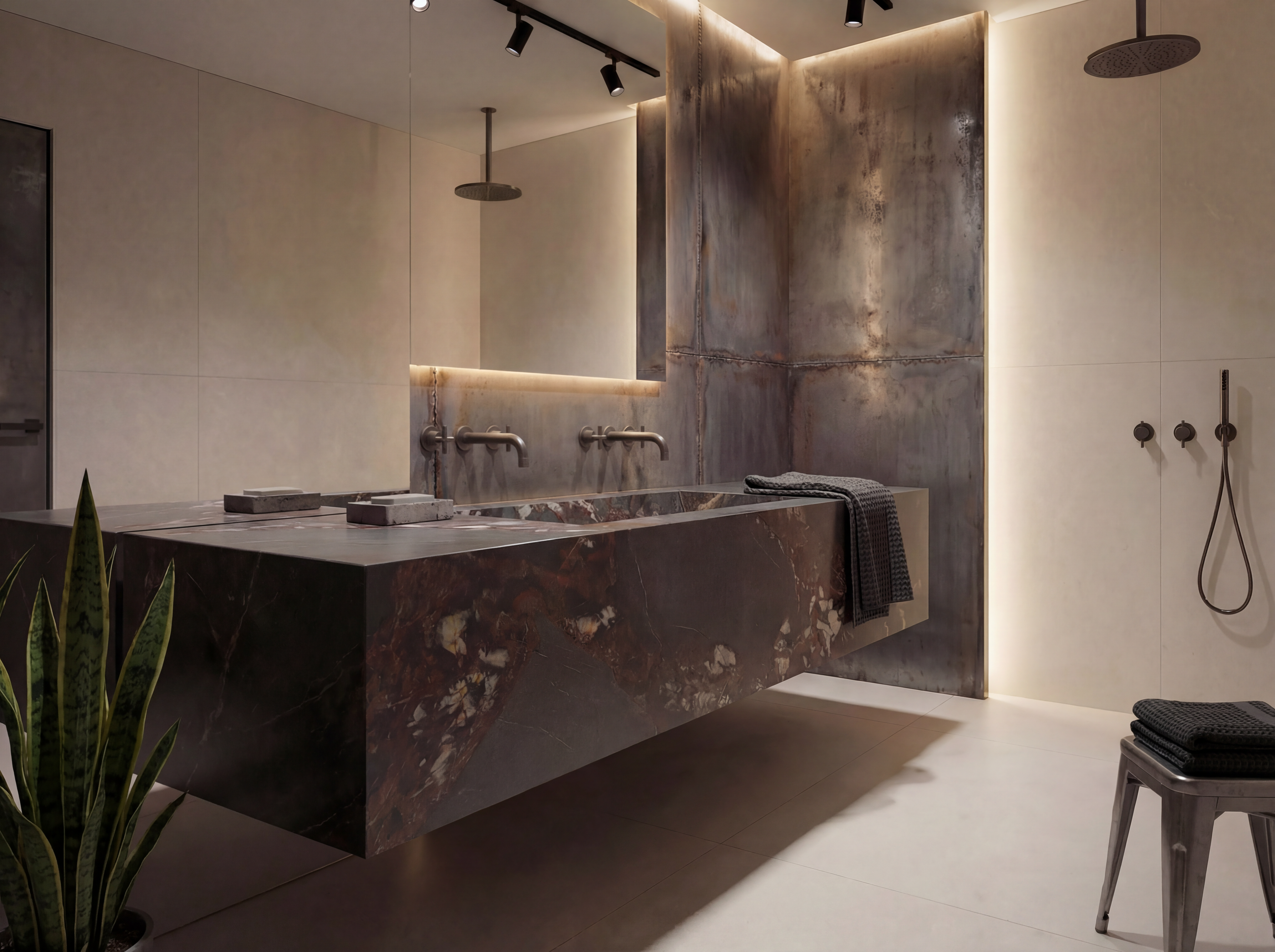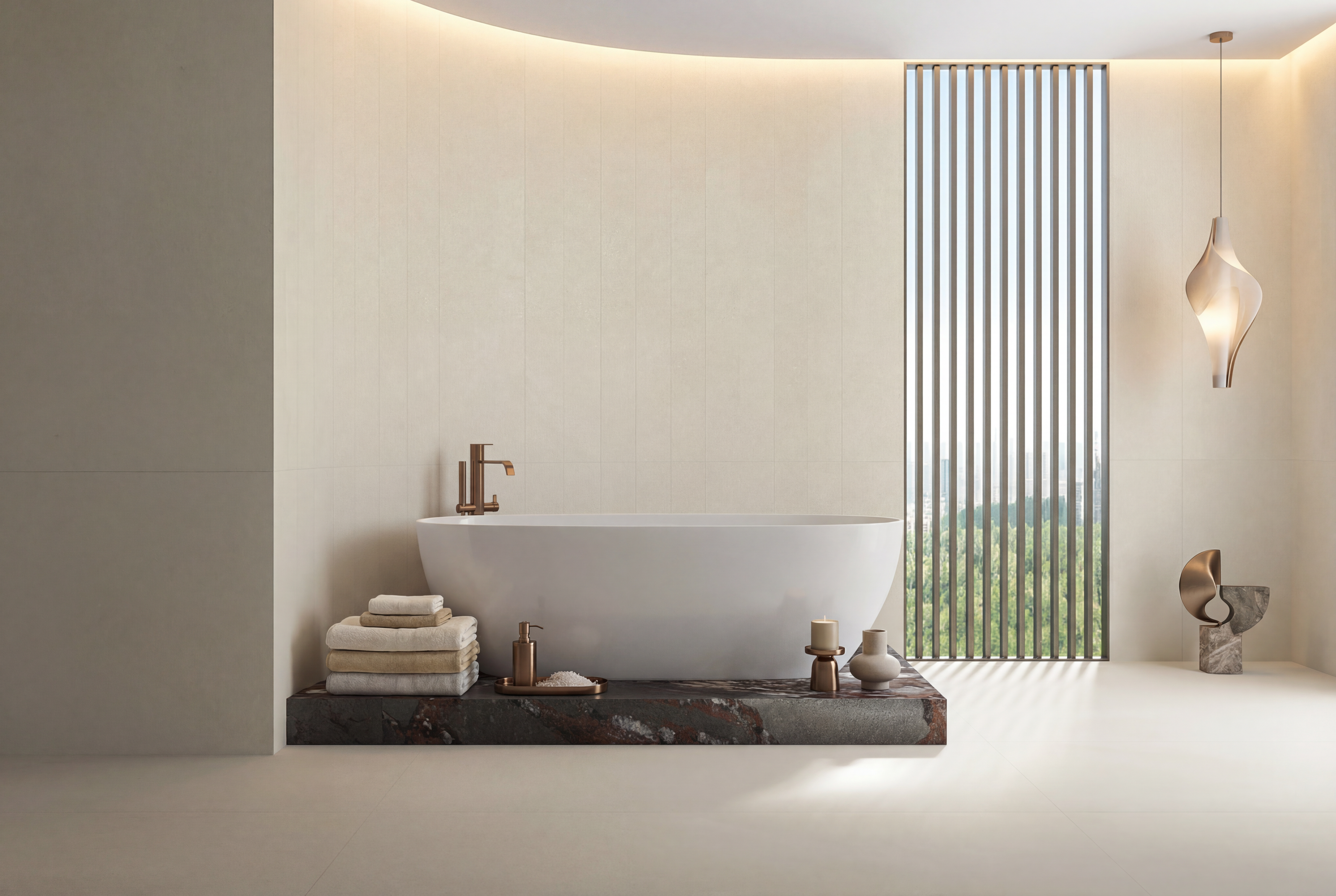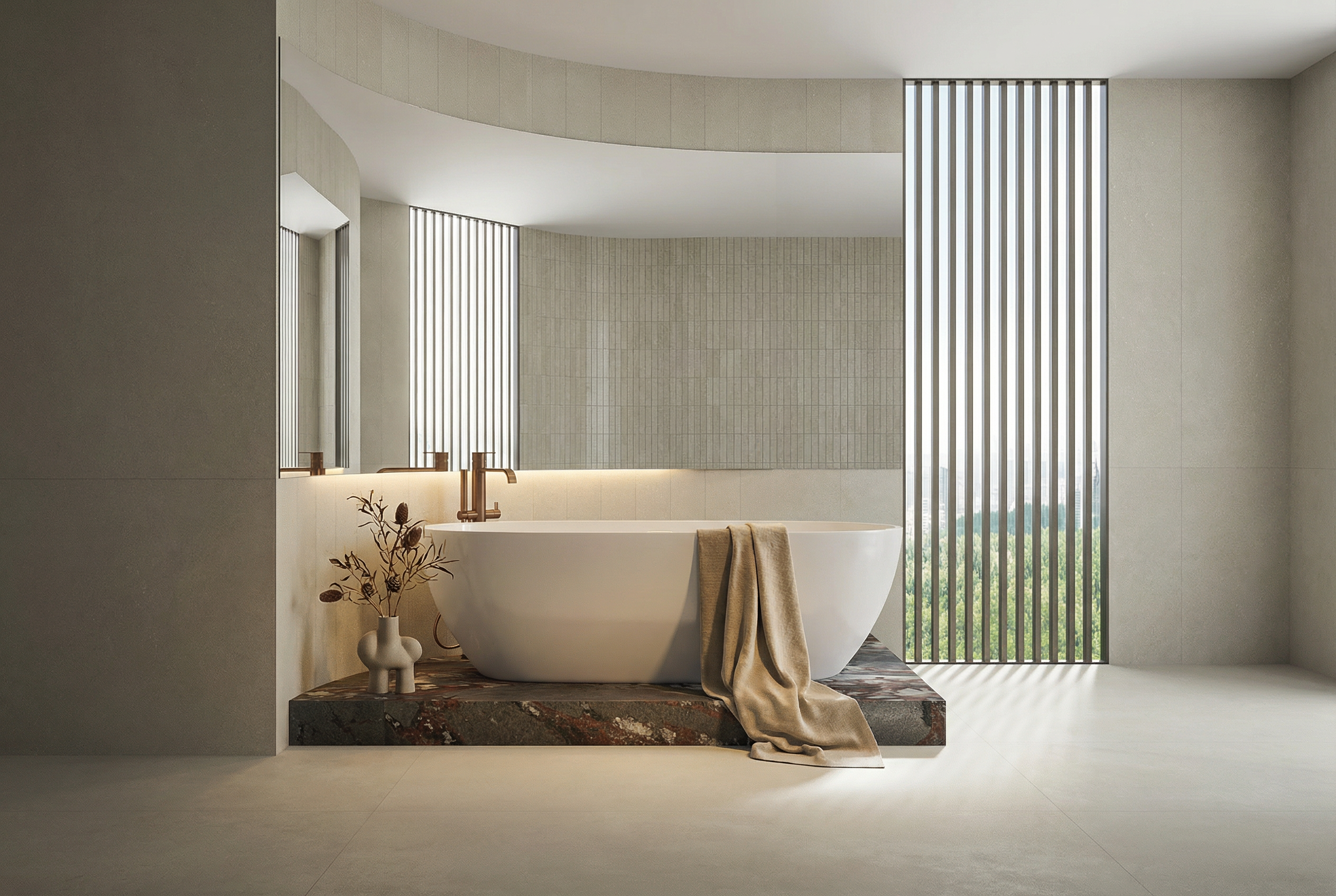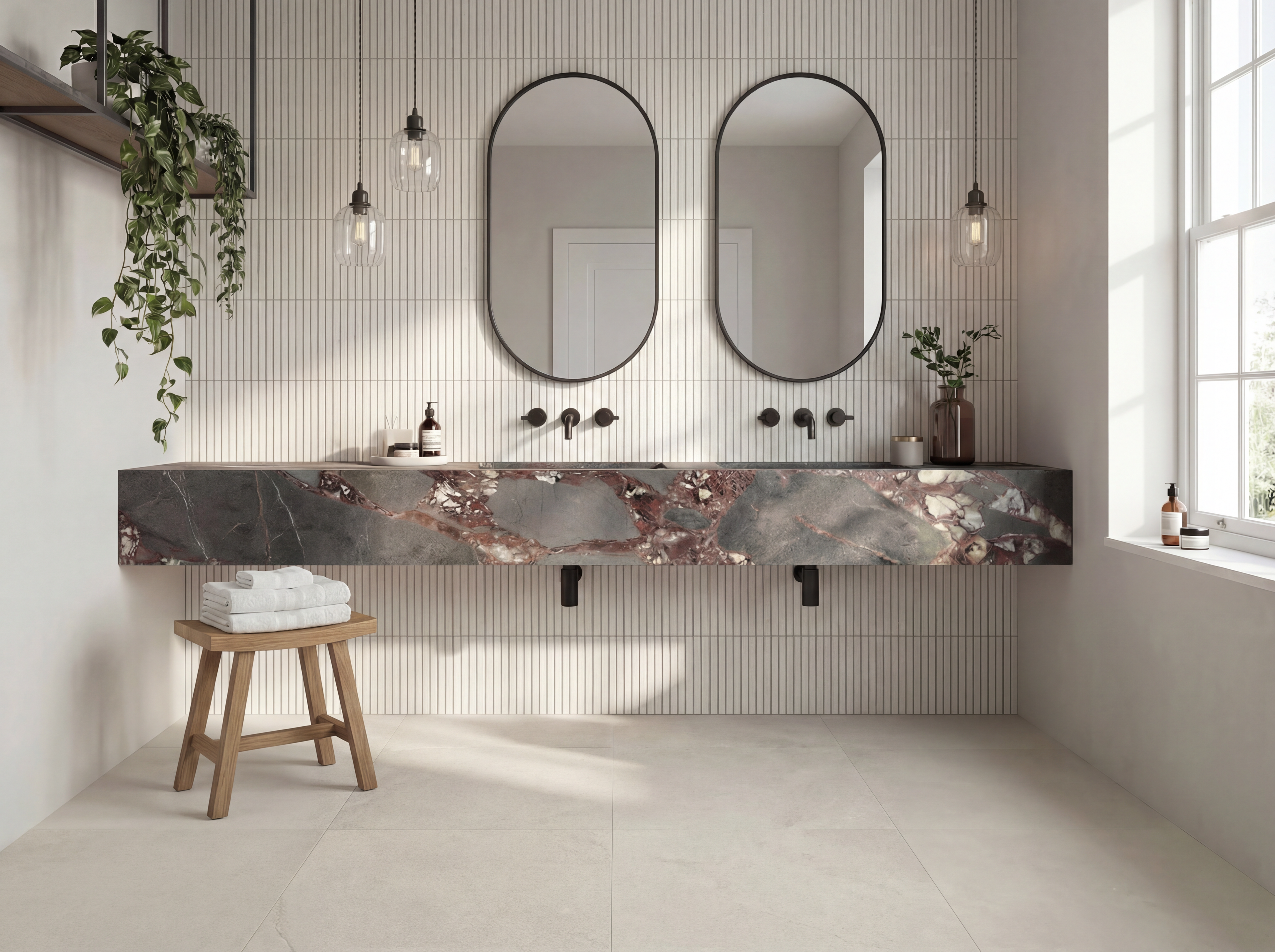 Coastal Industrial blends architectural strength with calm natural texture. Bois Jourdan and Moon Light tiles are used across floors, walls, and even ceilings — creating a monolithic, wrapped-space effect. The curved shower wall clad in Stix XL mosaics introduces movement and softness, contrasting beautifully with the industrial character of the tile. Tuscan Bronze tapware brings warmth and grounds the palette, making the space feel modern, sculptural, and richly tactile.It’s industrial, but not cold. Contemporary, but still comfortable. A bathroom with strong lines and soft curves — made for modern architecture and thoughtful interiors.