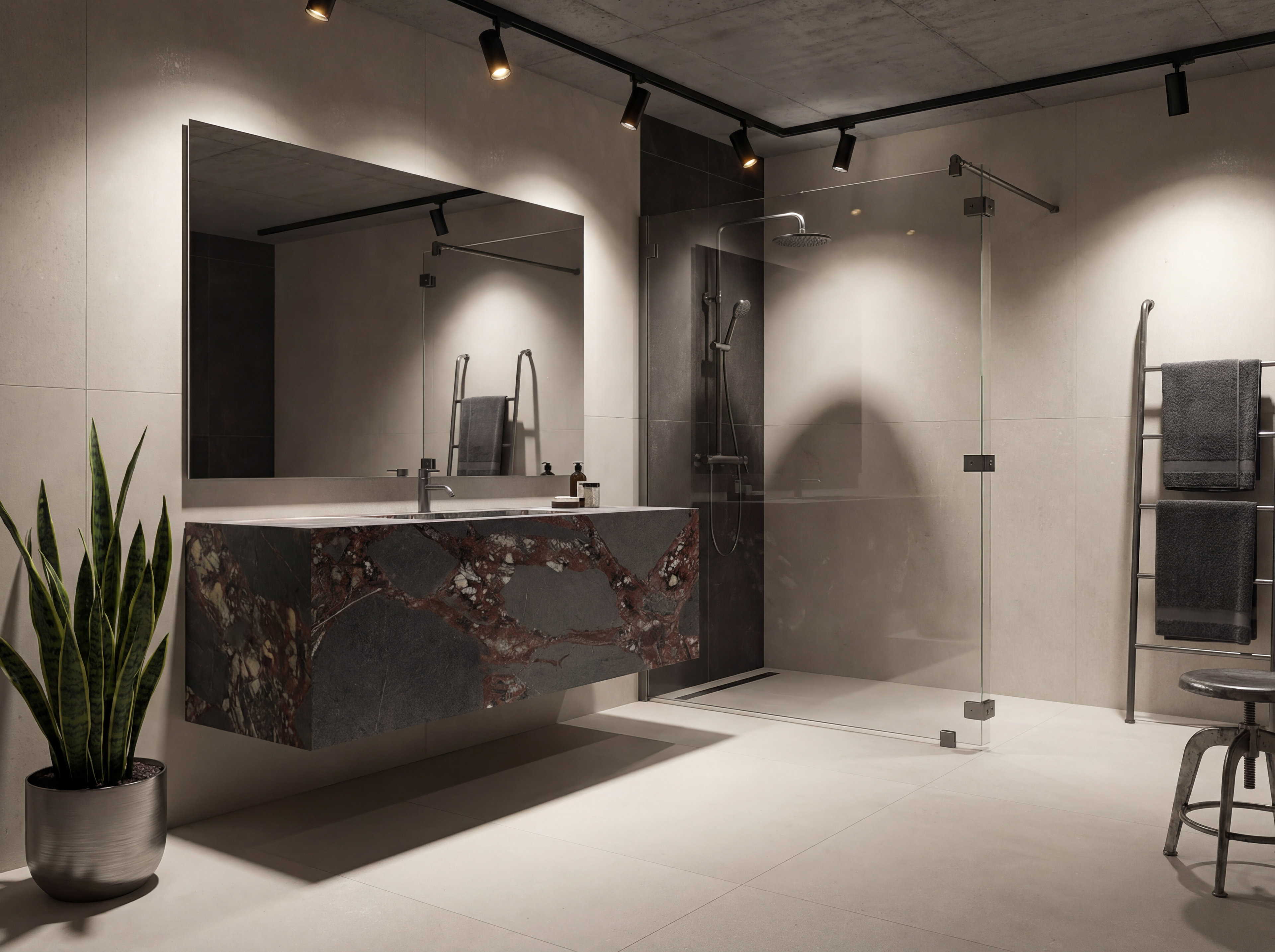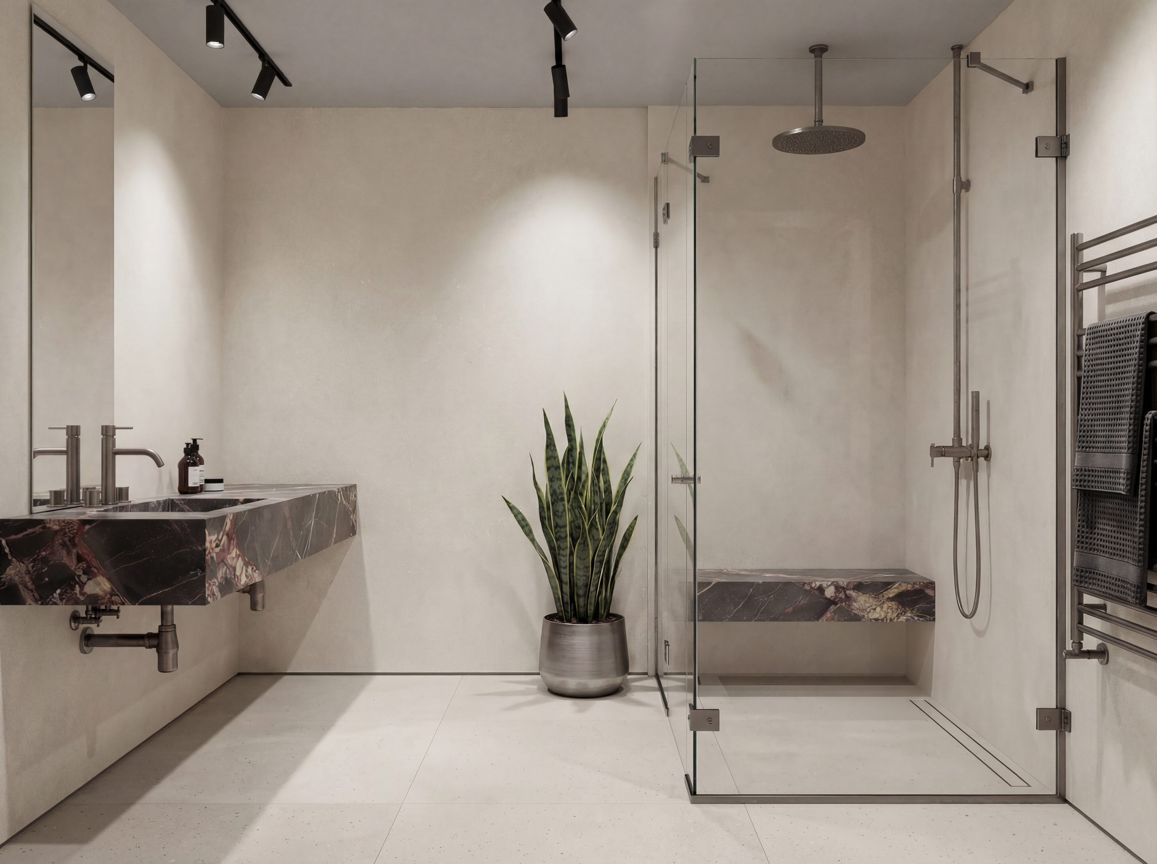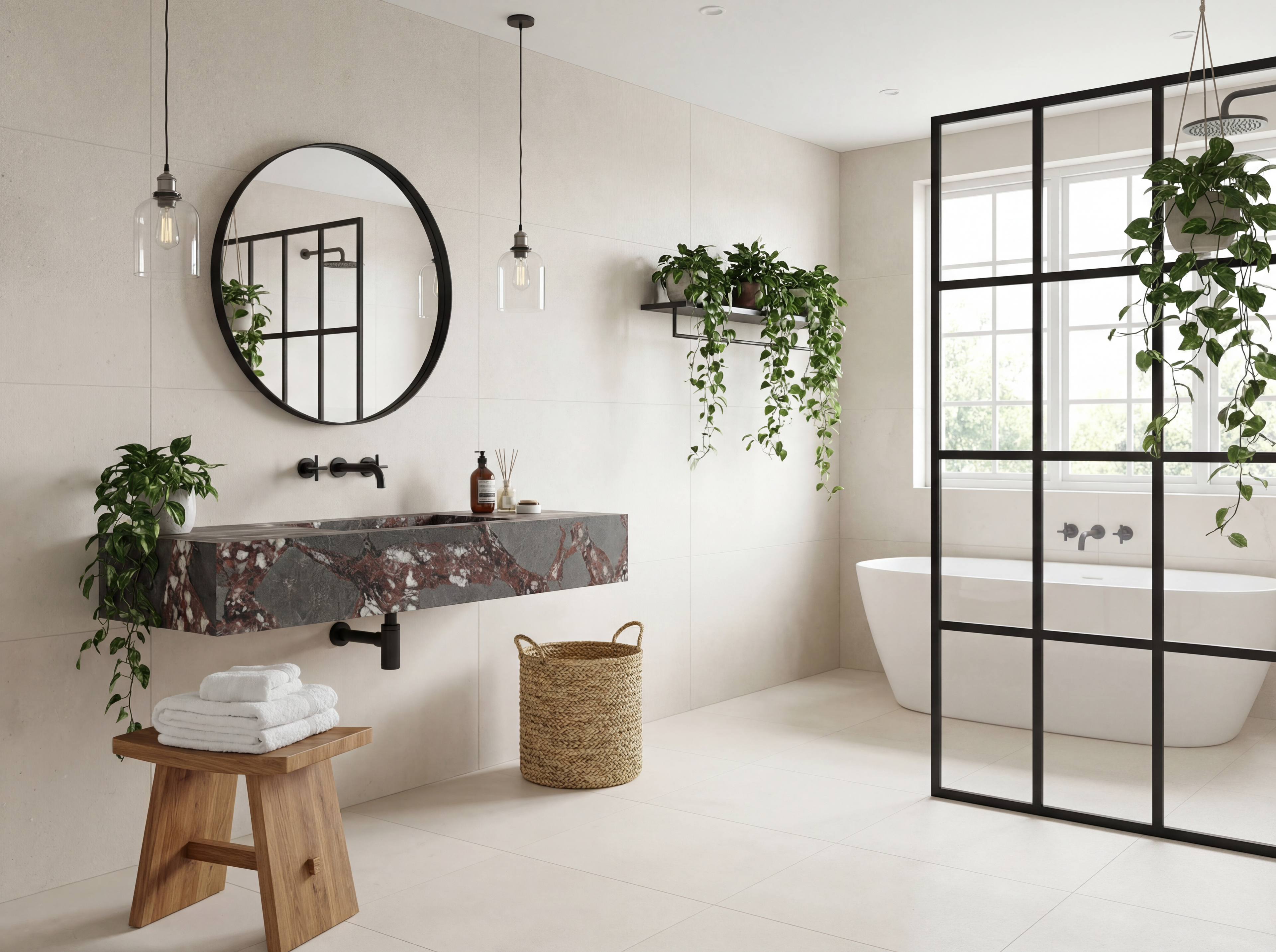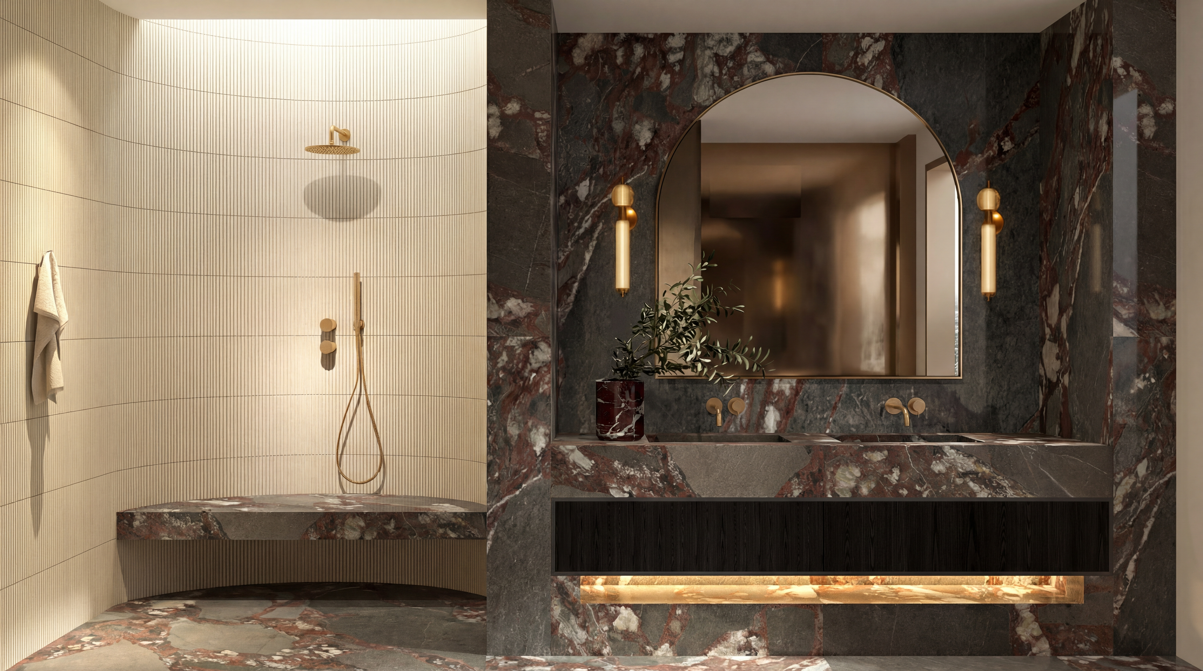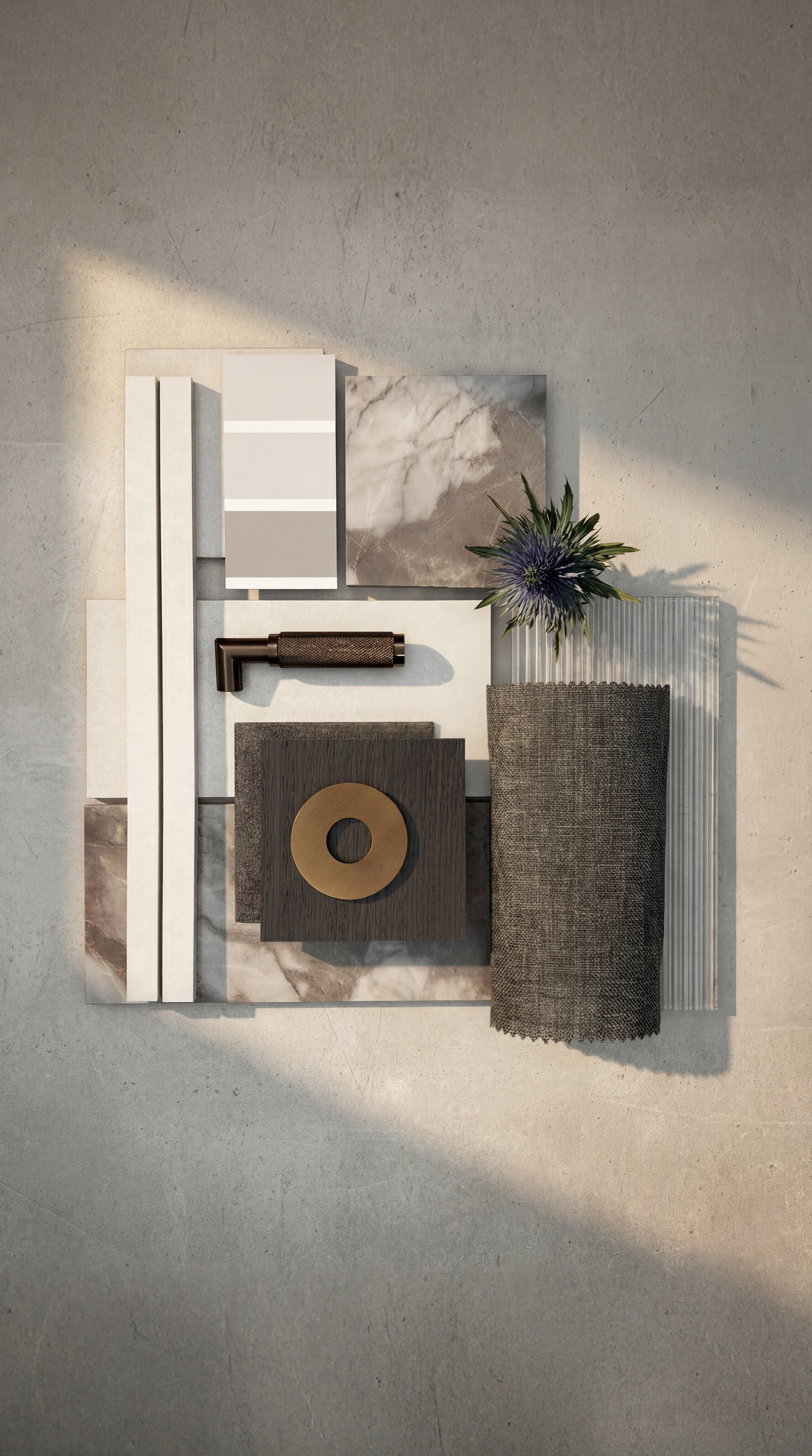 Coastal Industrial blends architectural strength with calm natural texture. Bois Jourdan and Moon Light tiles are used across floors, walls, and even ceilings — creating a monolithic, wrapped-space effect. The curved shower wall clad in Stix XL mosaics introduces movement and softness, contrasting beautifully with the industrial character of the tile. Tuscan Bronze tapware brings warmth and grounds the palette, making the space feel modern, sculptural, and richly tactile.It’s industrial, but not cold. Contemporary, but still comfortable. A bathroom with strong lines and soft curves — made for modern architecture and thoughtful interiors.