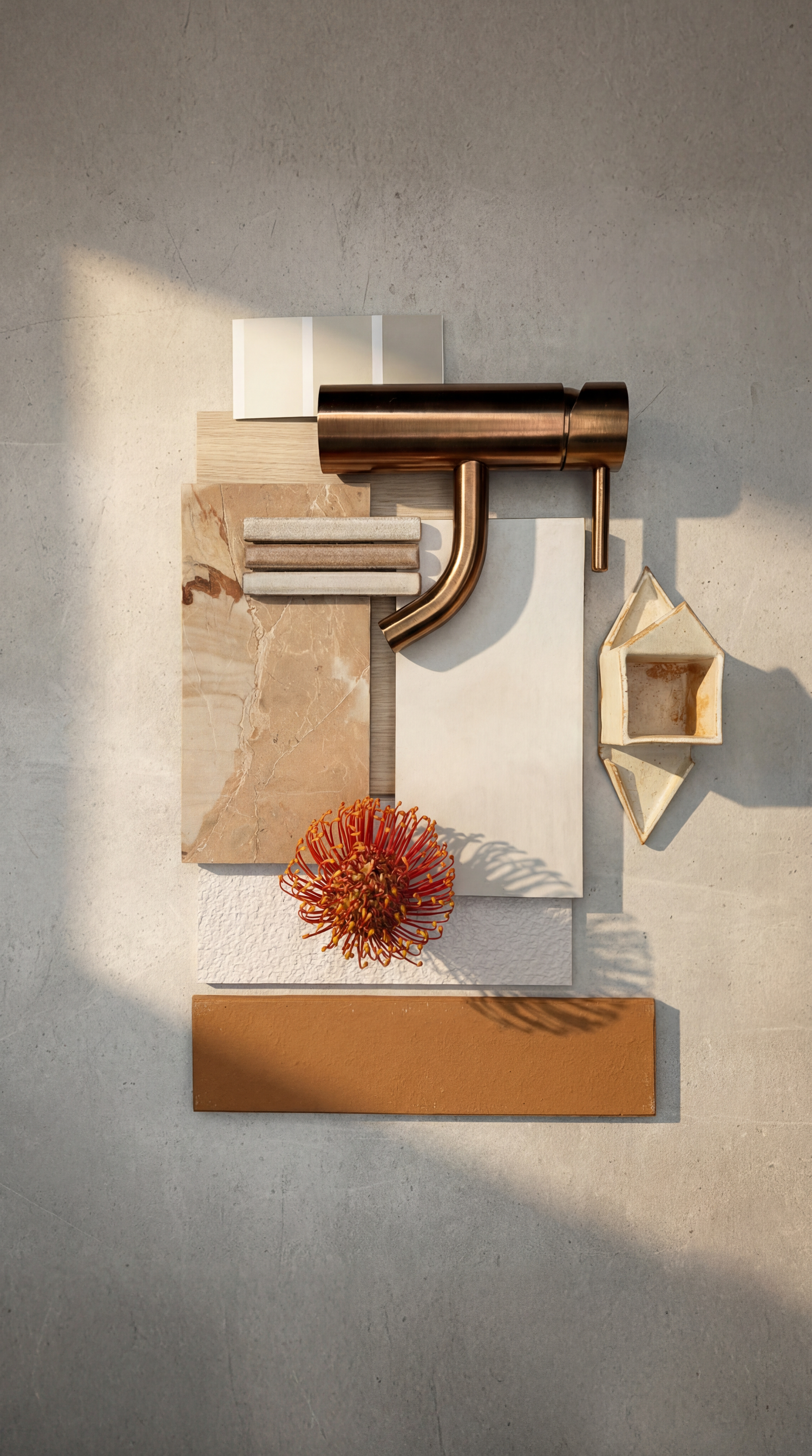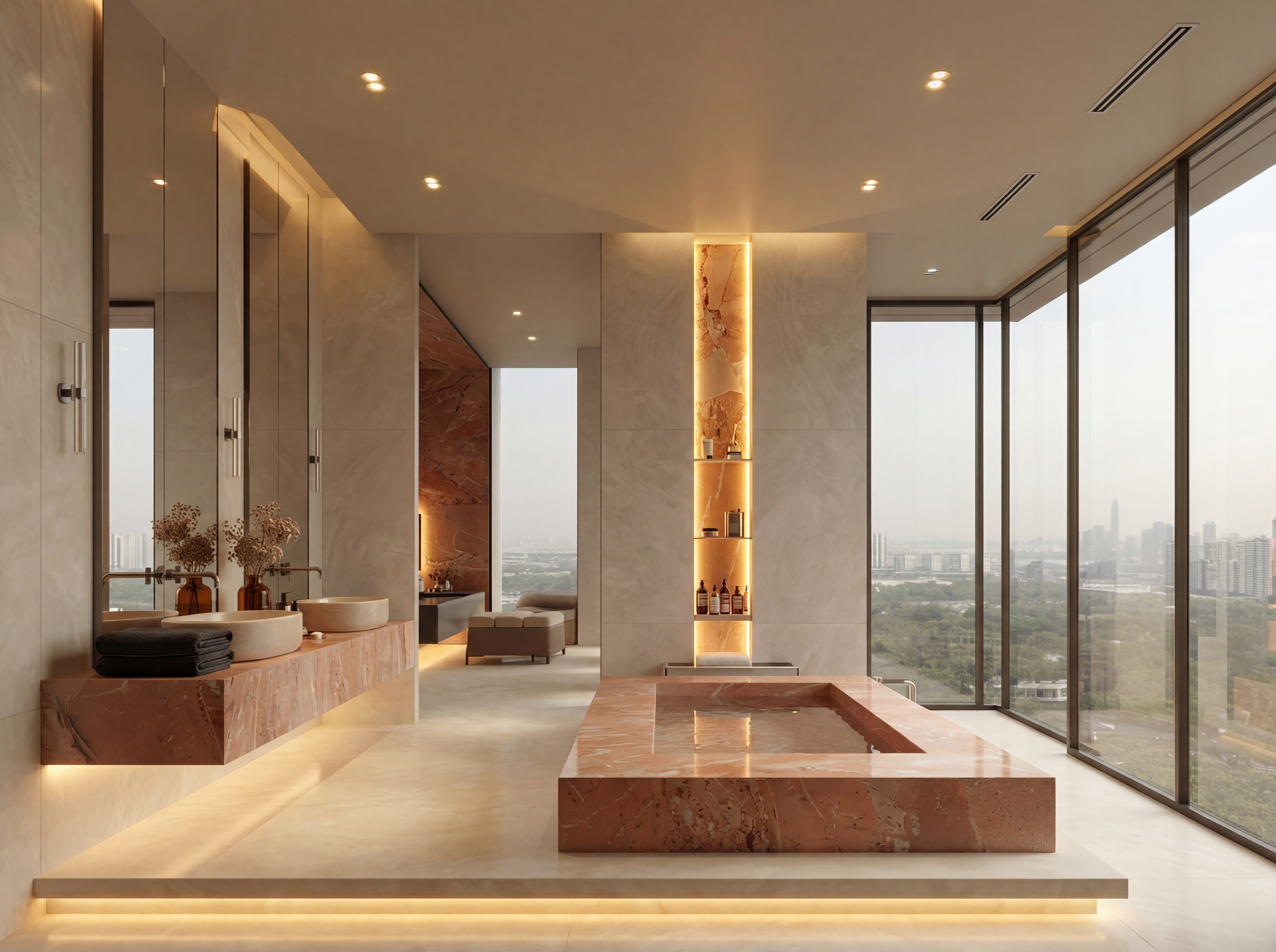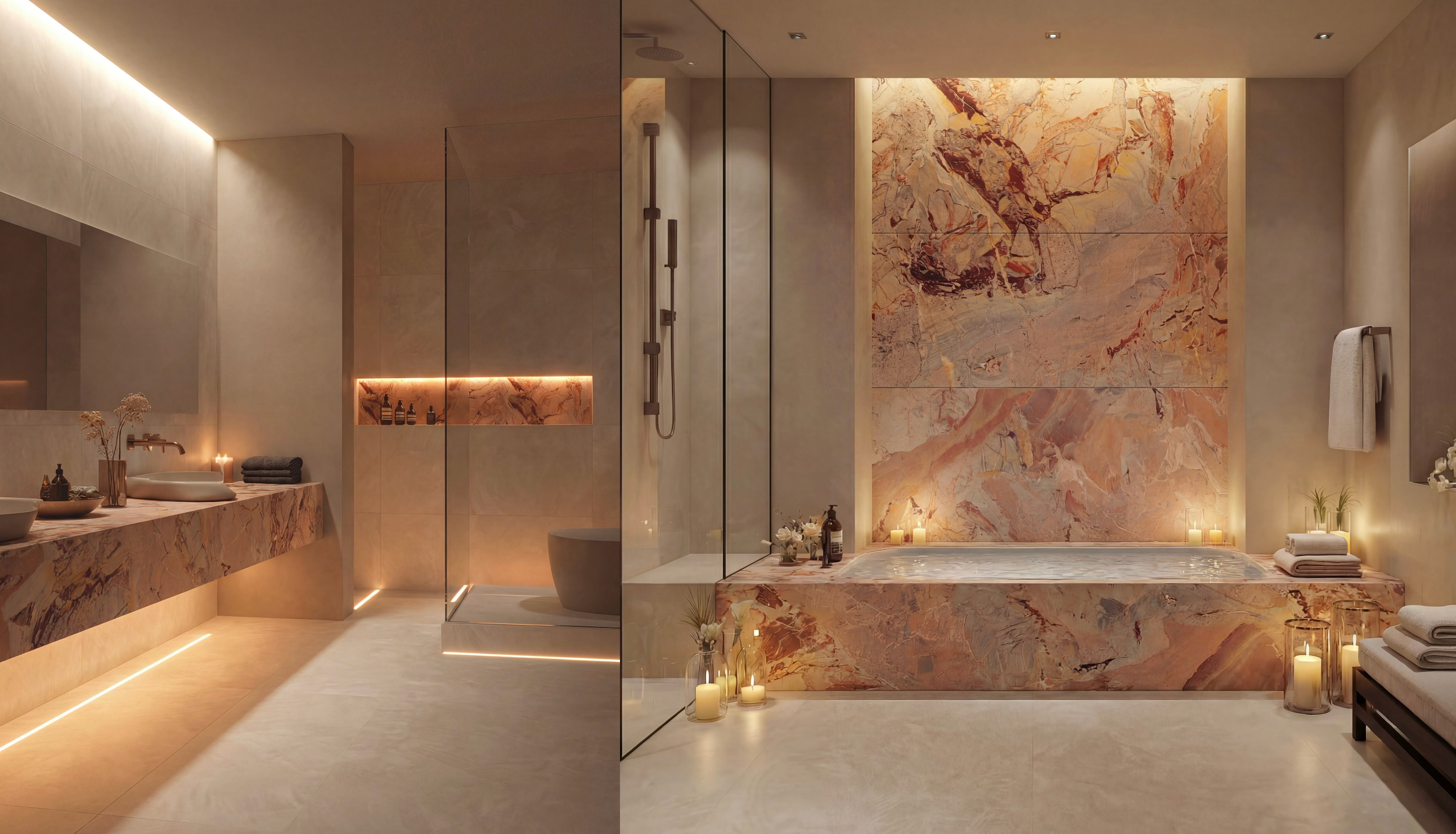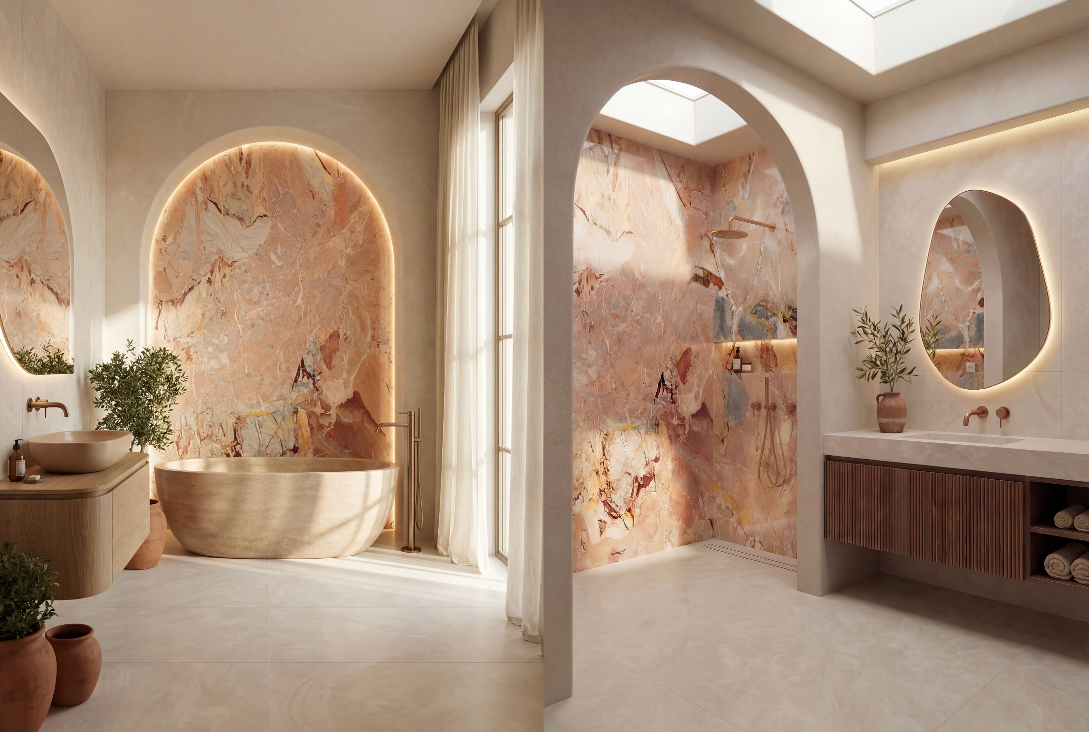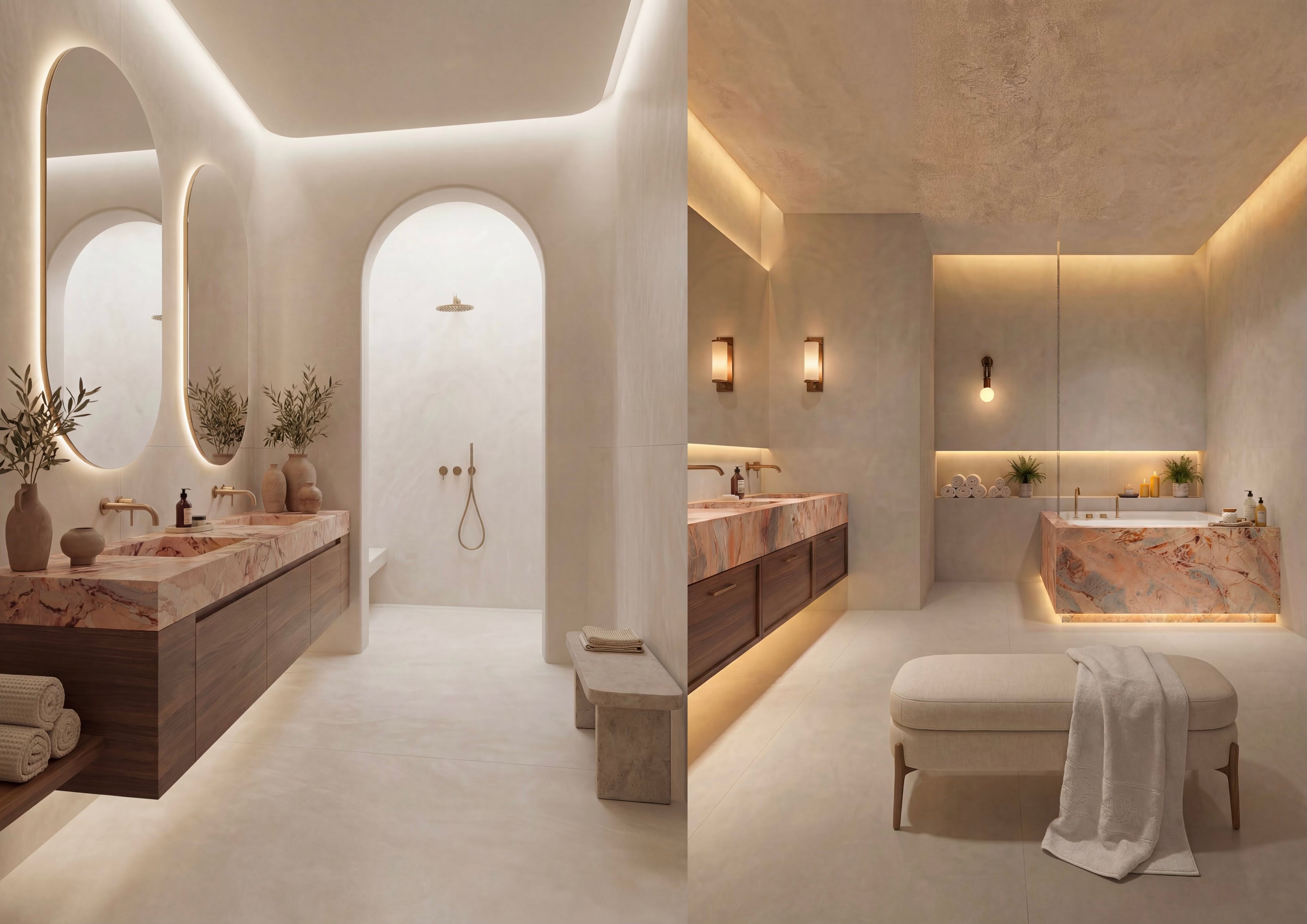 Spa Sanctuary is designed to feel like a private retreat — calm, tactile, and deeply restorative. Venato Bianco tiles create a warm, glowing foundation, while Rosa Patara introduces soft blush and peach undertones that bring warmth without feeling feminine or decorative. Venetian-render-inspired wall textures add a handcrafted, soothing quality that feels both natural and refined. Accents in Tuscan Bronze tapware complete the palette, making the space feel grounded, serene, and quietly luxurious.This is not just a bathroom — it feels like a place to unwind, prepare, recharge, and disconnect.