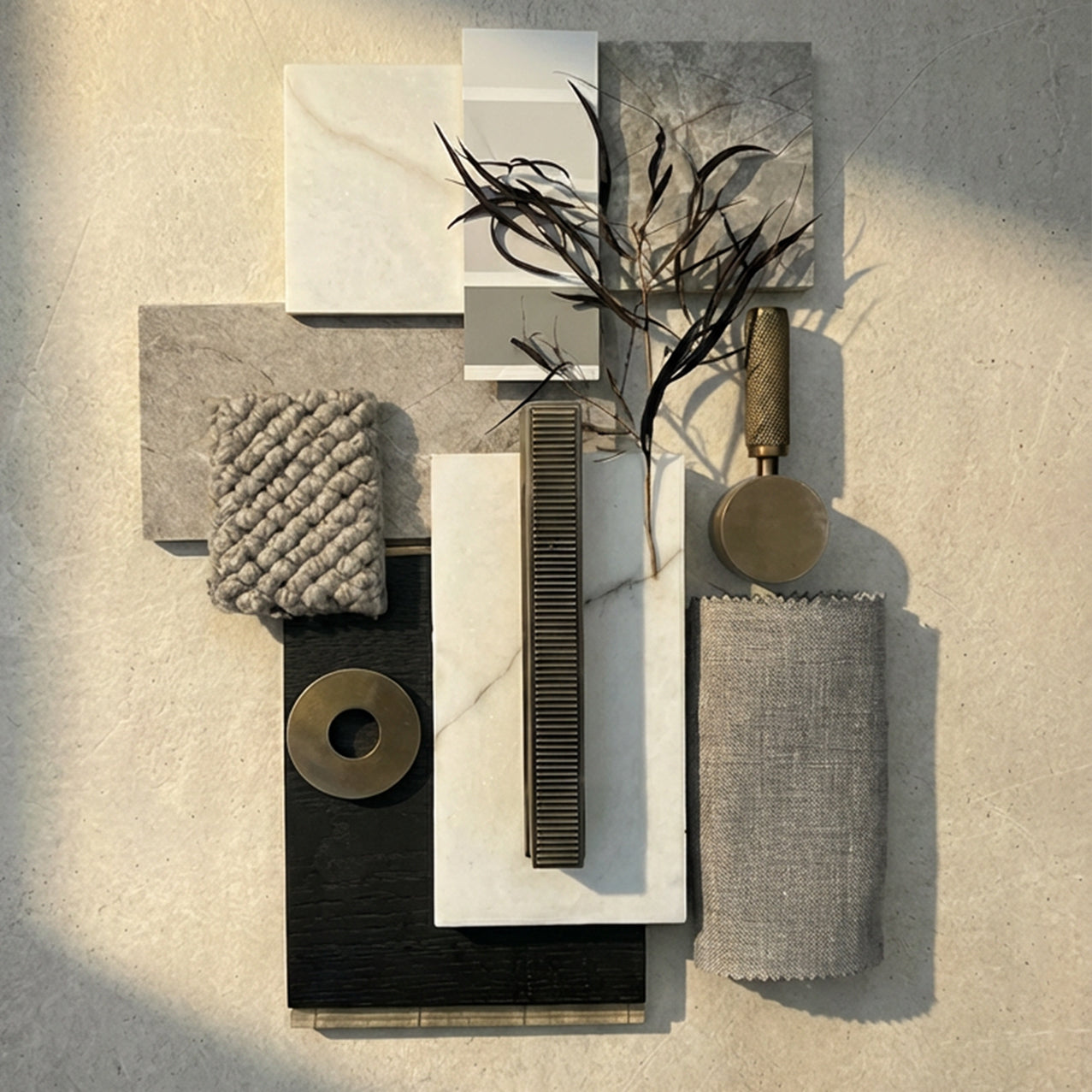 It’s a modern monochrome, but softer — not stark black and white, but warm grey, creamy white, brushed brass, and dark timber tones. Thoughtful, elegant, and genuinely livable.