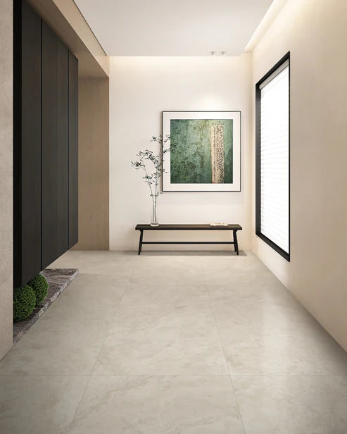 Natural Living is about calm spaces, soft textures, and mindful simplicity. The Tuscan Crème tile flows across walls, floors, and vanity, creating harmony through tone and texture. The curved mosaic feature wall introduces gentle movement without adding visual contrast — a detail that feels thoughtful, custom, and balanced. Paired with brushed chrome tapware and light timber cabinetry, this bathroom concept feels warm, quiet, and welcoming — natural without being rustic, minimalist without feeling cold.