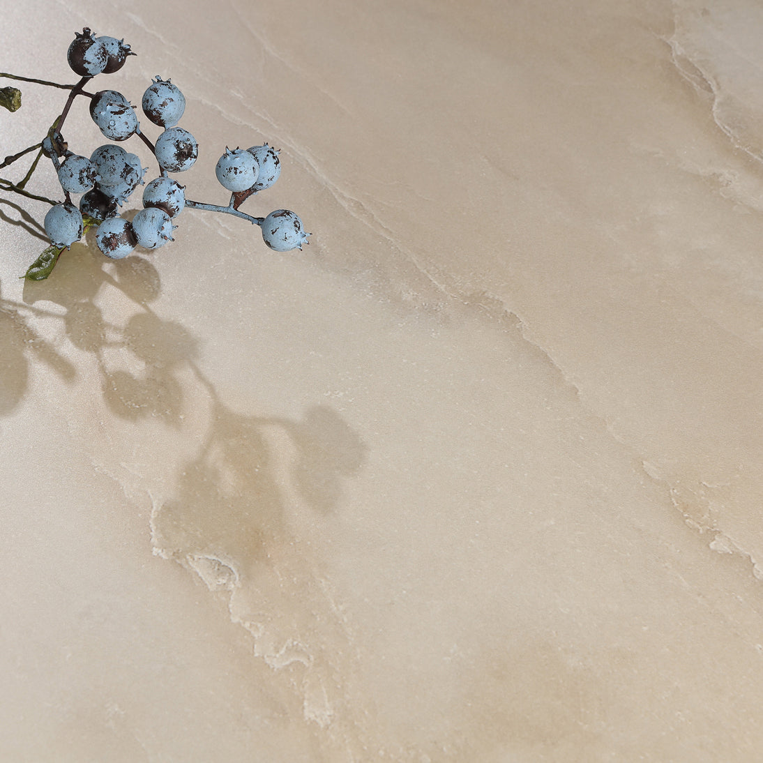Onyx Whisper radiates warmth, depth, and understated luxury. The Onix Cloud tile in 900×1800 Endless Vein format creates a seamless flow across walls and floors, giving the impression of continuous surface rather than tile segments. The Breccia Aurora vanity block introduces sculptural presence, while Venato Bianco mosaics bring a handcrafted touch — detailed but not decorative, luxurious but not loud.